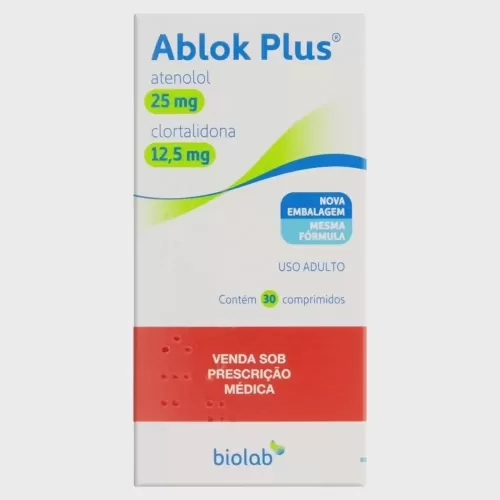 Comprar via WhatsAppAblok Plus 25/12,5mg é um medicamento indicado para o tratamento da hipertensão arterial (pressão alta). Sua fórmula combina dois princípios ativos: o atenolol (25mg), um betabloqueador que atua no controle da frequência cardíaca, e a clortalidona (12,5mg), um diurético que ajuda a eliminar o excesso de sódio e água do organismo. O uso contínuo ajuda a manter a pressão sob controle e reduzir o risco de complicações cardiovasculares. Embalagem com 30 comprimidos revestidos, para uso oral e conforme prescrição médica.