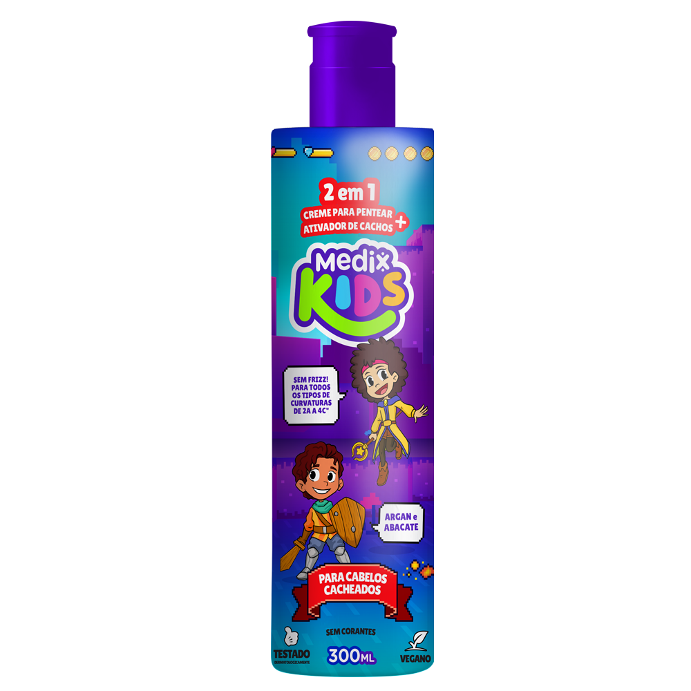 O Creme de Pentear + Ativador de Cachos 2 em 1 Medix Kids é ideal para crianças com cabelos cacheados ou ondulados, proporcionando definição, hidratação e controle do frizz. Sua fórmula leve e sem enxágue facilita o desembaraço e mantém os cachos alinhados e com movimento natural.