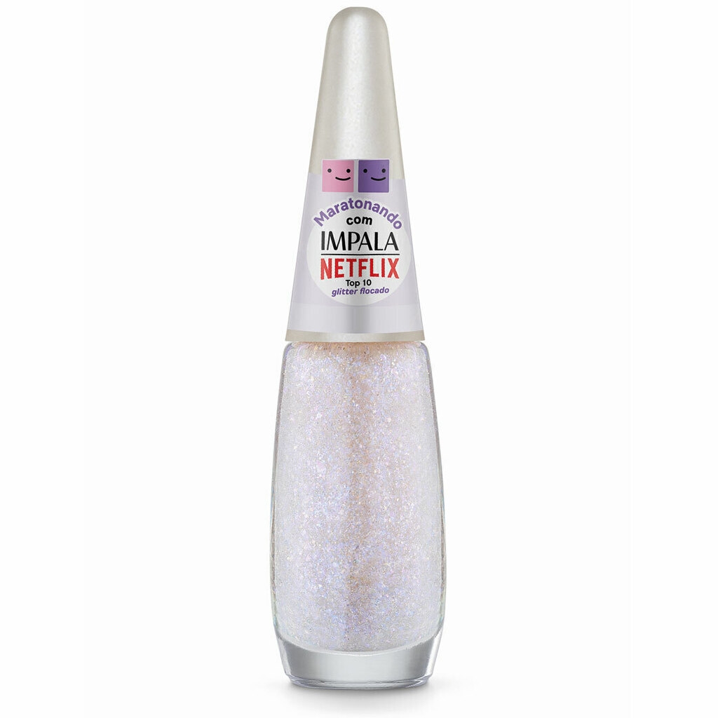 O Esmalte Impala Maratonando Netflix Top 10 traz um glitter flocado multicolorido intenso, ideal para unhas modernas e divertidas, criando um efeito luminoso que destaca qualquer esmaltação. Pode ser usado sozinho para um visual chamativo ou como cobertura para dar brilho extra em outros esmaltes. Possui secagem rápida, alta durabilidade e longa fixação, garantindo unhas bonitas por mais tempo. Sua fórmula é vegana, hipoalergênica e cruelty-free, sendo segura para peles sensíveis, enquanto o pincel anatômico facilita a aplicação sem falhas.