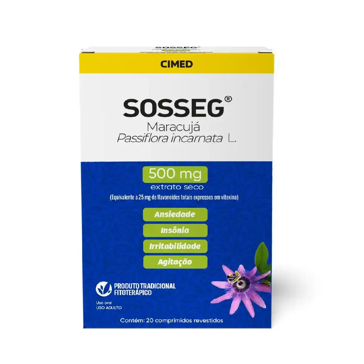Comprar via WhatsAppSosseg 500mg é um fitoterápico desenvolvido com extrato de Passiflora incarnata, tradicionalmente usado para promover o relaxamento e o bem-estar. Indicado como auxiliar no alívio da ansiedade leve e na melhora da qualidade do sono. Cada embalagem contém 3 blisters com 10 comprimidos revestidos, totalizando 30 unidades. Uso oral. Antes de utilizar, leia atentamente a bula e siga a orientação de um profissional de saúde.